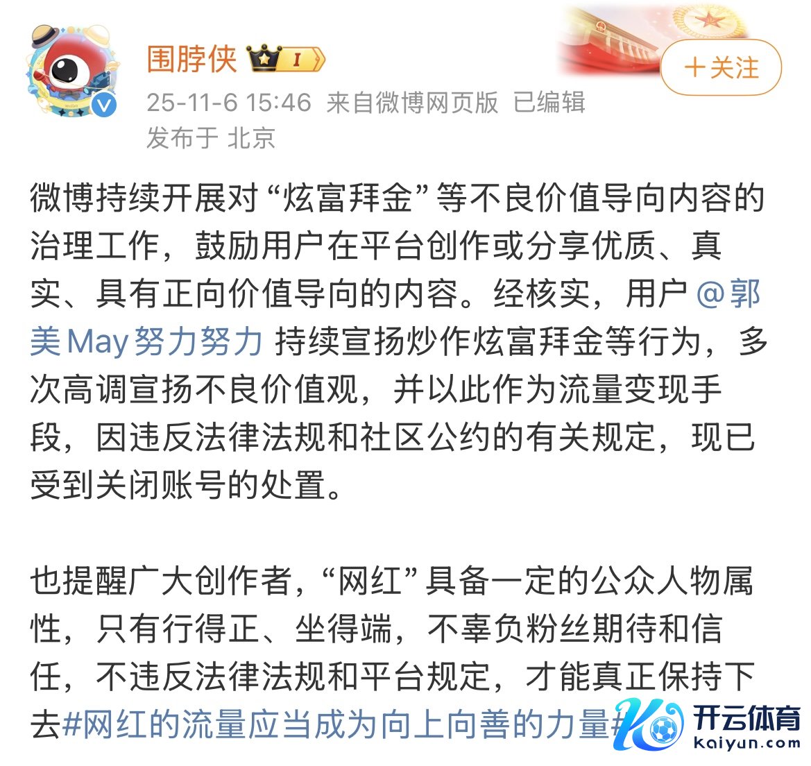 网红想靠“炫富”来致富开云体育(中国)官方网站,抱歉,此路欠亨。实时叫停劣迹网红的复前程,既需平台信守审核底线,更需轨制造成长效震慑。只须如斯,能力让流量回反正向价值轨谈,让相聚空间本来清源。