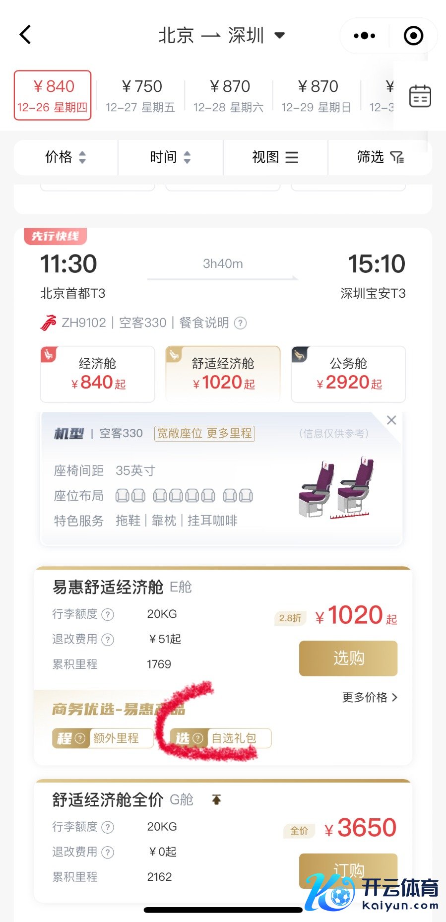 深圳航空小步伐需点“选购”下方的“自选礼包”材干看到居品表现。图/深圳航空小步伐截图