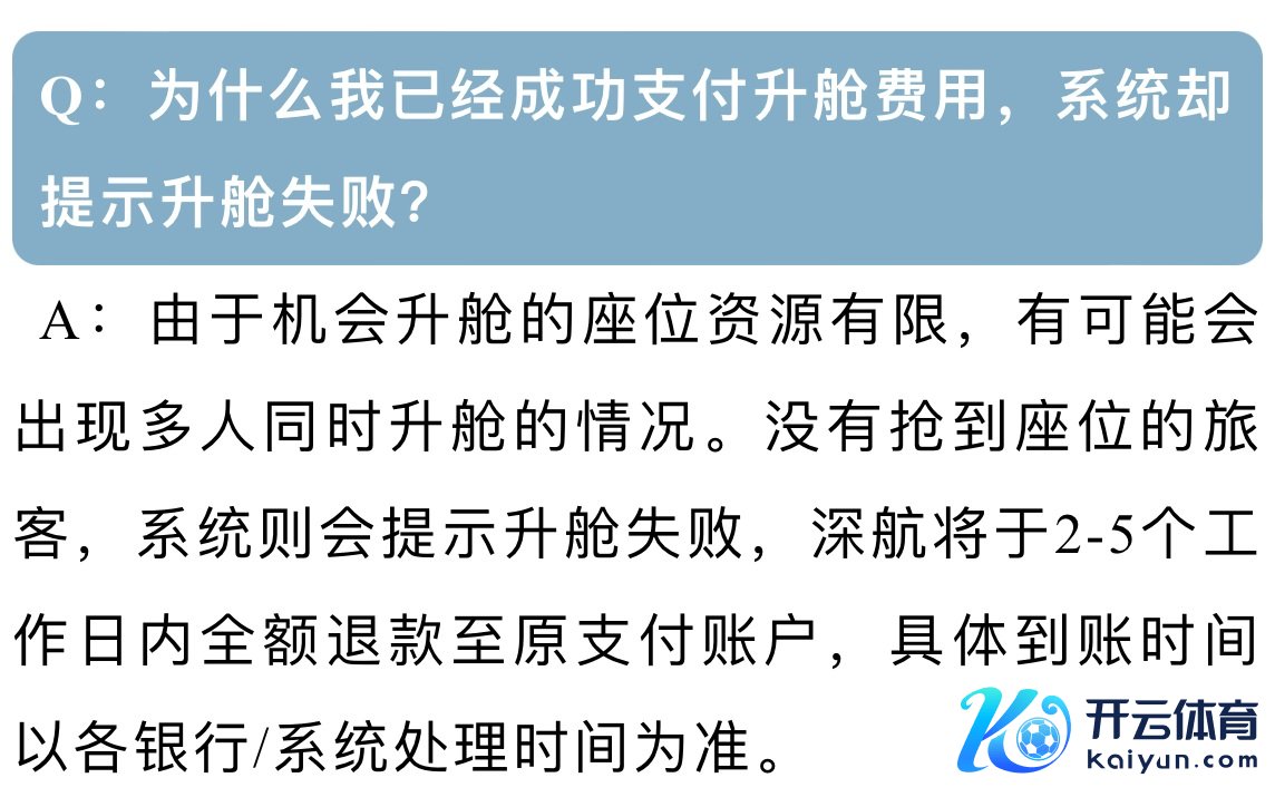 针对“为什么我依然得手支付升舱用度,系统却教唆升舱失败?”的问题,该应知给予表现:“由于契机升舱的座位资源有限,有可能会出现多东谈主同期升舱的情况。莫得抢到座位的游客,系统则会教唆升舱失败,深航将于2-5个职责日内全额退款至原支付账户,具体到账时辰以各银行/系统处治时辰为准。”