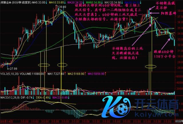 后来,股价加快下落伸开一轮跌势,这种高位的量、价、方针同步空头共振的形态称之为三死叉见顶。