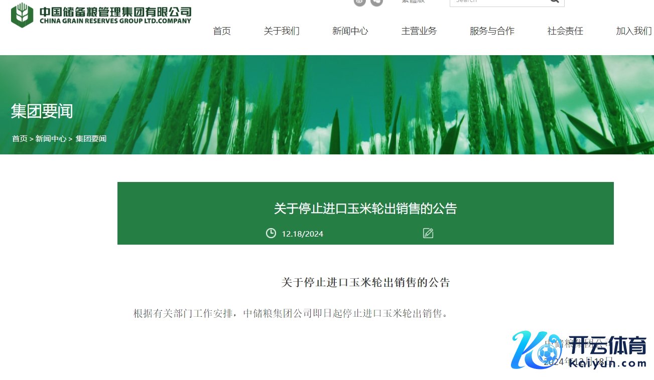 12月18日,中储粮集团公司发布公告称云开体育,凭据关连部门责任安排,中储粮集团公司即日起住手入口玉米轮出销售。