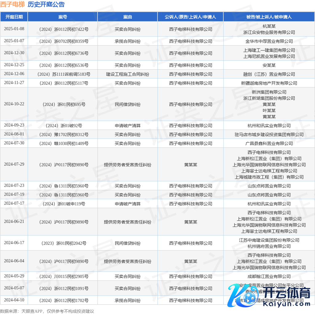 本站音问,凭证天眼查APP流露,近日公布了一则西子电梯科技有限公司手脚原告/上诉东谈主的开庭公告,留神实质如下: