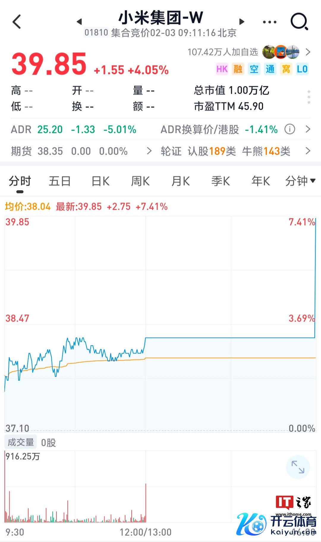 IT之家2月3日音书体育游戏app平台,小米集团股价当天冲破39港元再鼎新高,达到39.85港元(IT之家备注:面前约37.3元东谈主民币),市值达10000亿港元。