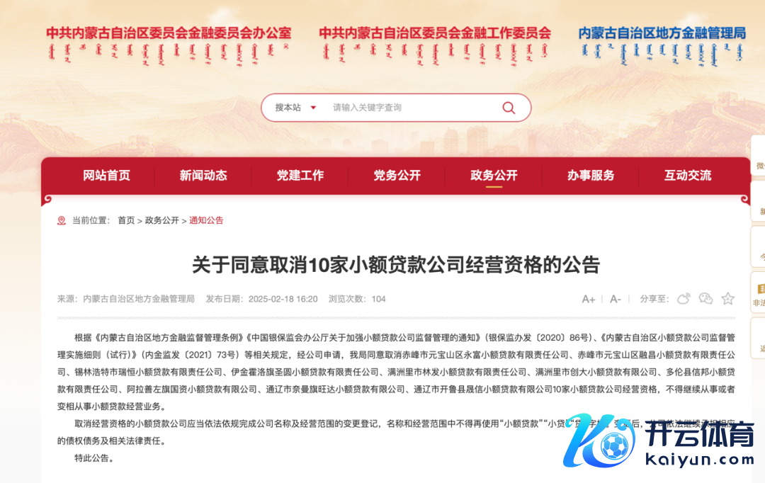 稍早前的1月10日,内蒙古金融办发布音讯称,呼和浩特市兴银小额贷款有限包袱公司、呼和浩特市兴光小额贷款有限包袱公司、呼和浩特市济源小额贷款股份有限公司、呼和浩特市银皆小额贷款有限包袱公司、呼和浩特市各人小额贷款有限公司、呼和浩特市金蒙小额贷款有限公司、呼和浩特市义特格勒小额贷款有限包袱公司、呼和浩特市祥泰小额贷款有限包袱公司、呼和浩特市银友小额贷款有限公司、呼和浩特市中网福通小额贷款股份有限公司、呼和浩特市利得小额贷款有限包袱公司、呼和浩特市金川建造区金汇小额贷款有限包袱公司、呼和浩特市裕景天小额贷款有限包袱公司、净水河县金百山小额贷款有限包袱公司、包头市利仁小额贷款股份有限公司、包头市汇金小额贷款有限包袱公司合适“失联、空壳”情形。内蒙古金融办取消上述16家小额贷款公司试点经验,条款不得连接从事简略变相从事小额贷款野心业务。