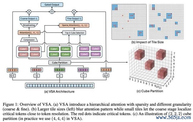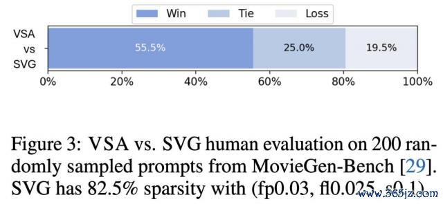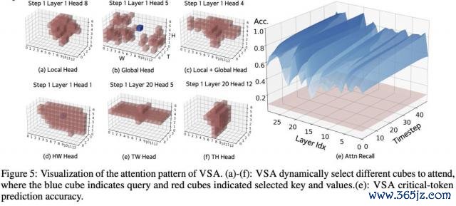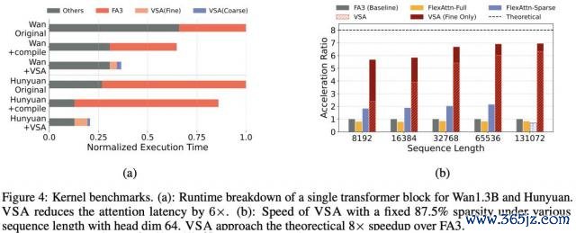 闭幕浮现,将 VSA 利用于 Wan-1.3B 和 Hunyuan 模子时(图 4a),推理速率进步达 2-3 倍。