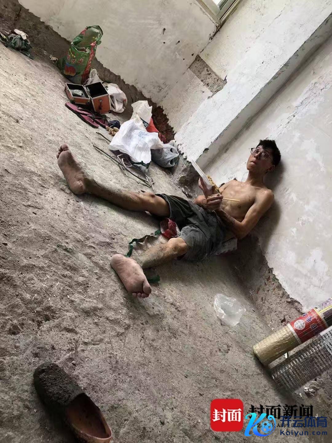 广东珠海工地,埋头弯腰,他赤膊扛着砖头,一梯梯攀爬在楼谈里,搬砖、砌墙,每时每刻。