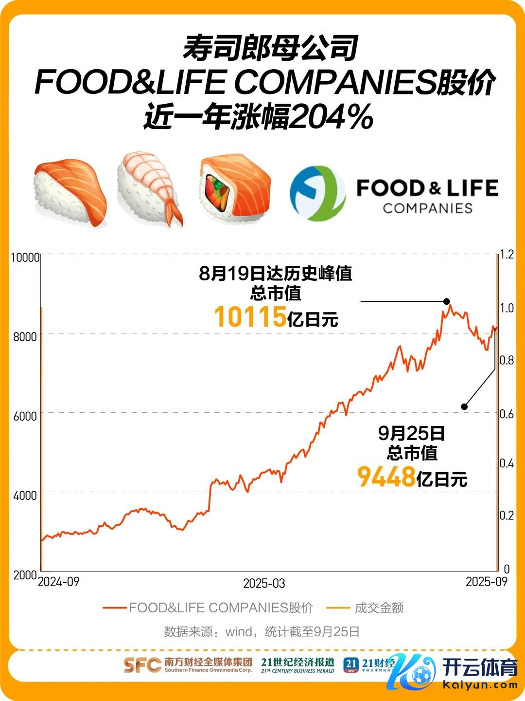 受此初始,FOOD&LIFE的股价在8月中旬总市值冲破1万亿日元,成为日本第二家达到万亿日元市值规模的餐饮企业。死心9月25日收盘,总市值为9448亿日元,其股价近一年涨幅高达204%。